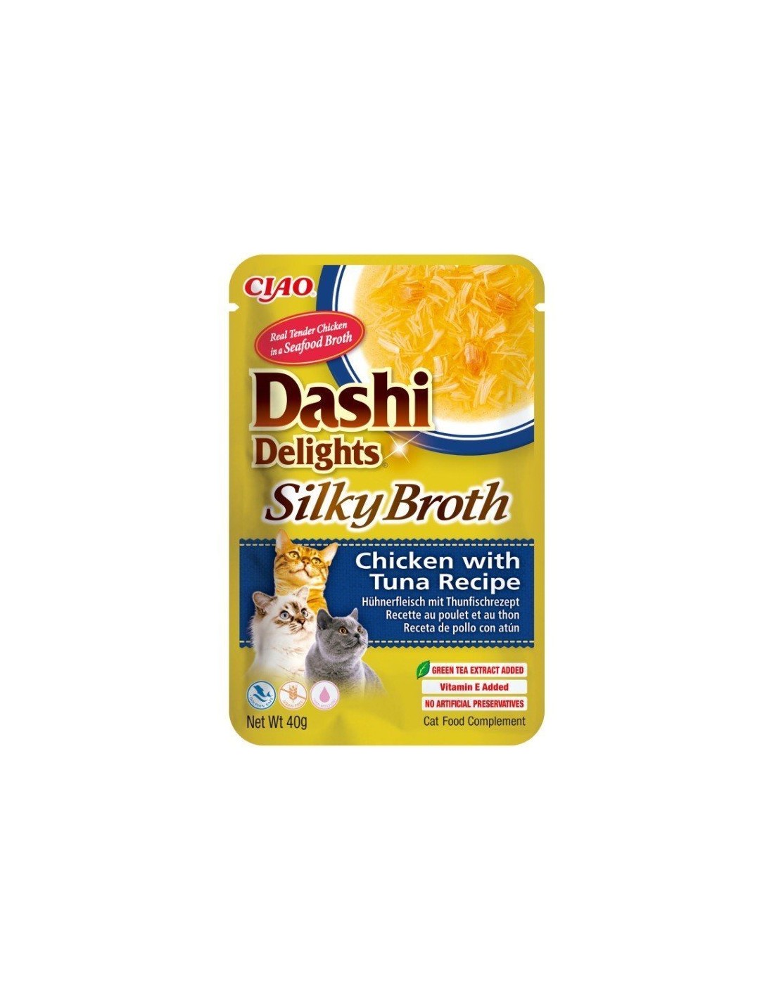 Caldo de vieira (80,6%), pollo (17,5%), atún (0,7%), copos de bonito, tapioca (deshidratada). Goma guar, goma xantana. Aromas, Camellia sinensis. Vitamina E 320 mg..