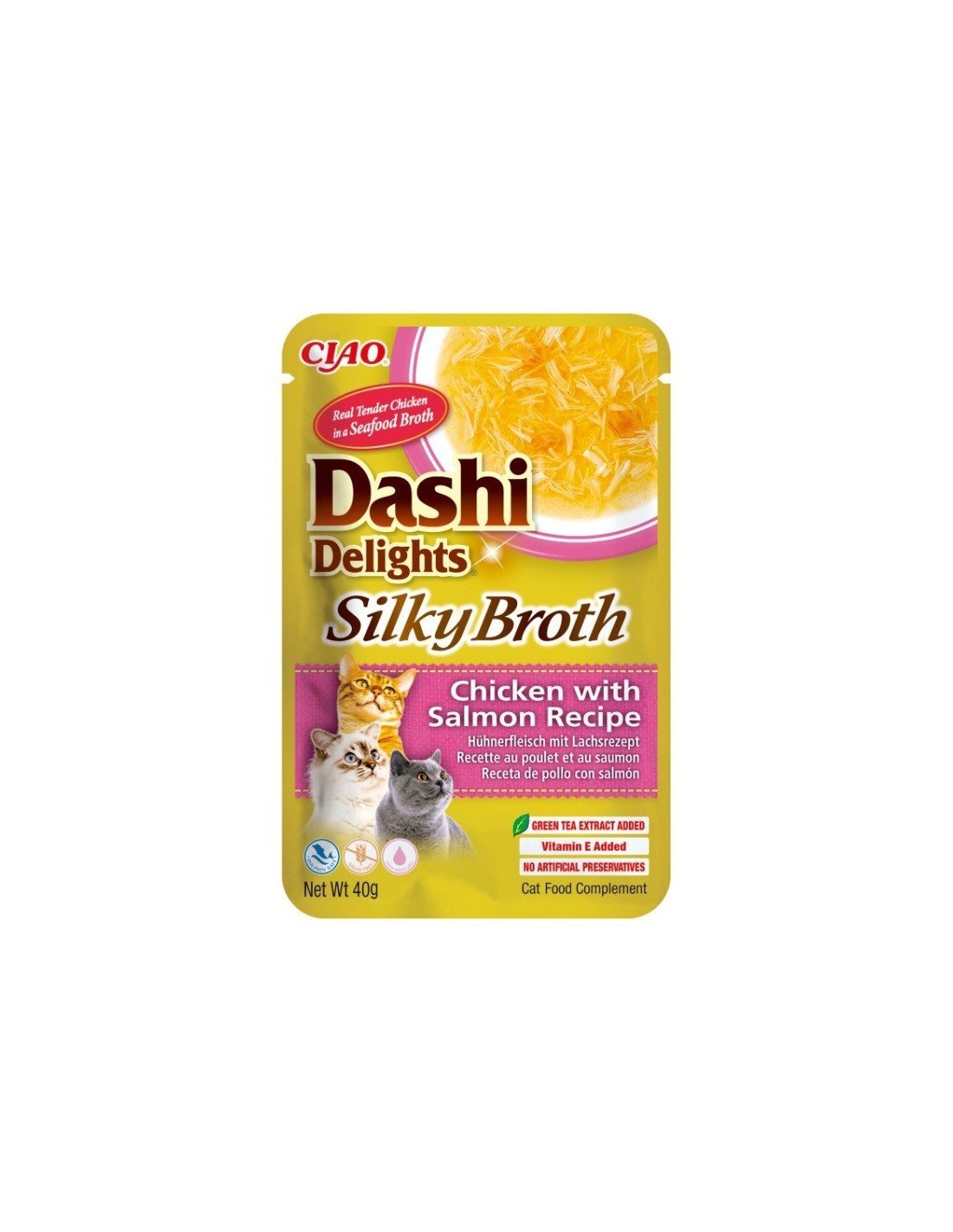 Caldo de vieira (80,6%), pollo (16,8%), salmón (0,7%), copos de bonito, tapioca (deshidratada). Goma guar, goma xantana. Aromas, Camellia sinensis. Vitamina E 320 mg.