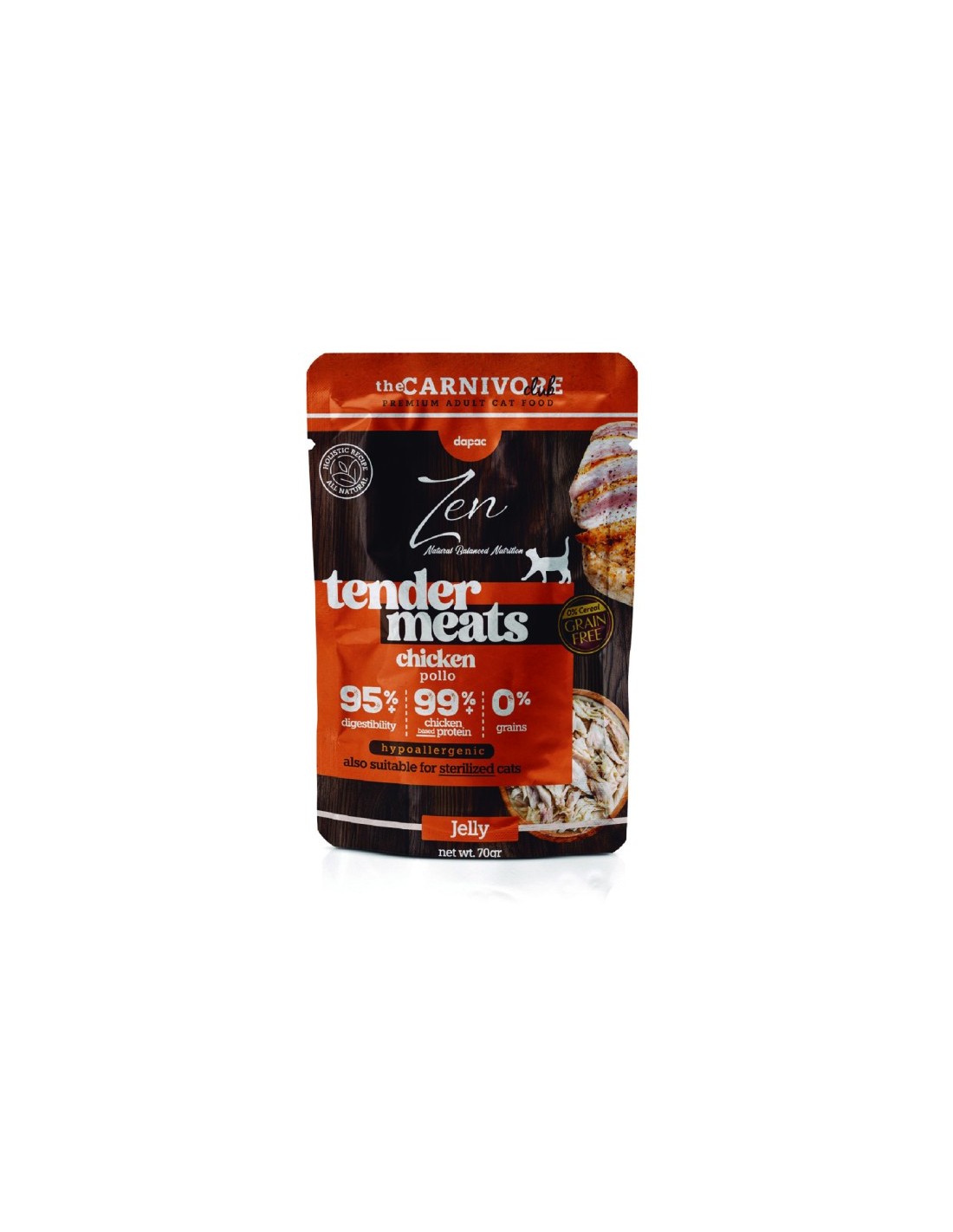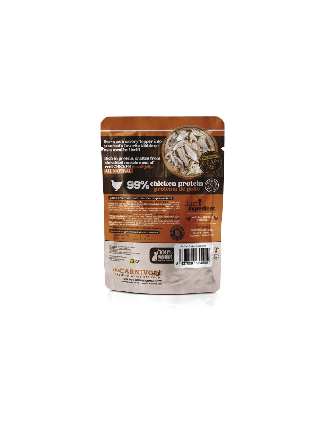 Delicioso alimento complementario premium con 99% proteína animal y un solo ingrediente principal: pollo.