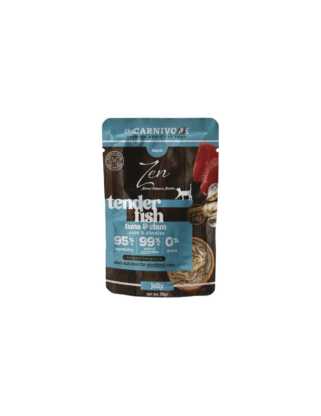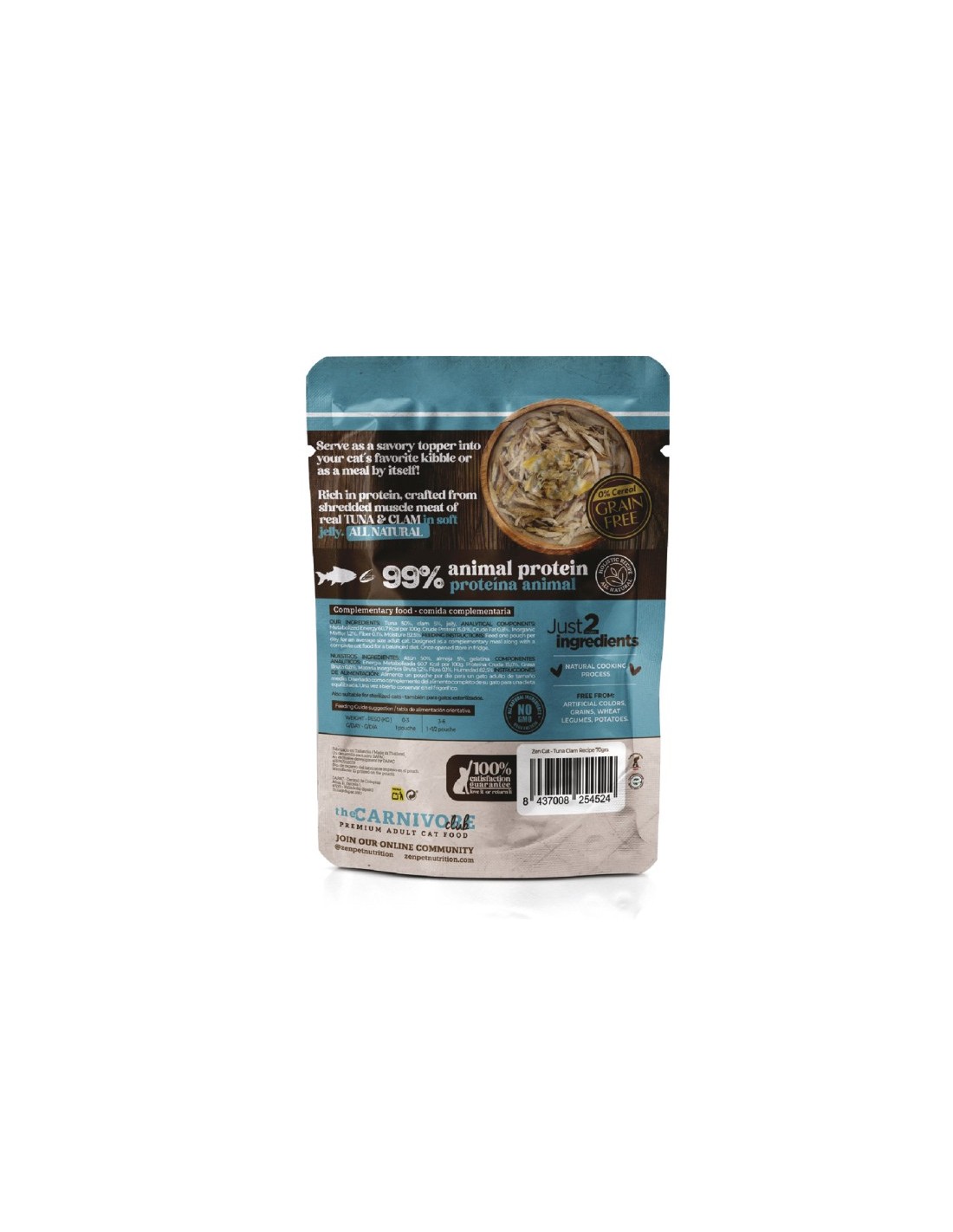 Delicioso alimento complementario premium, rico en proteína animal (99%) y sin cereales, elaborado con auténtico atún y almejas en gelatina suave.