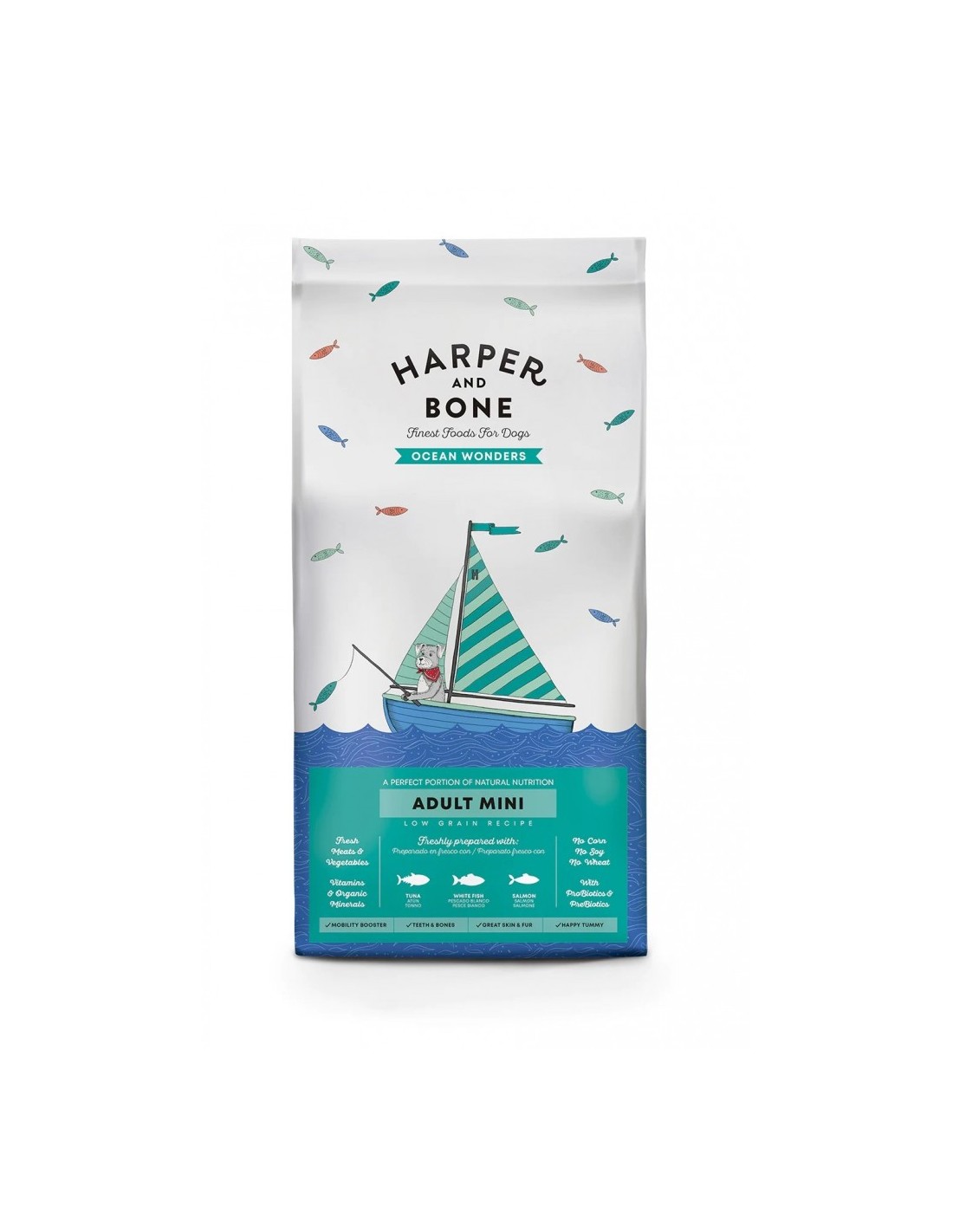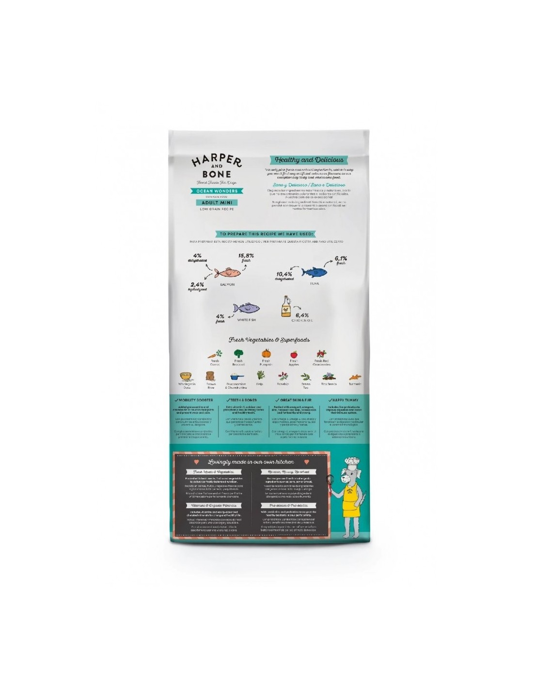 salmón preparado en fresco 15,8%, guisantes verdes enteros, atún deshidratado 10,4%, arroz extrusionado, atún preparado en fresco 6,1%, arroz integral 6%, aceite de pollo (protegido con tocoferoles naturales) 6,4%, proteína de guisantes, cebada integral, salmón deshidratado 4%, pescado blanco preparado en fresco 4%, proteína de arroz, avena integral 3,6%, salmón hidrolizado 2,4%, semillas de lino 0,5% (fuente natural de ácidos grasos ?3), pulpa de remolacha, fibra de manzana, levaduras (Saccharomyces cerevisiae), minerales, brócoli fresco 1000 mg/kg, calabaza fresca 1000 mg/kg, manzanas frescas 1000 mg/kg, zanahorias frescas 1000 mg/kg, glucosamina 1000 mg/kg, condroitina 600 mg/kg, pared celular hidrolizada de levaduras (fuente de MOS) 500 mg/kg, achicoria (fuente de FOS) 500 mg/kg, extracto de mandarina 500 mg/kg, Yucca schidigera 200 mg/kg, alga kelp 30 mg/kg, arándanos rojos enteros 30 mg/kg, rosa canina (rica en vitamina C) 30 mg/kg, té verde 30 mg/kg, cúrcuma 30 mg/kg.