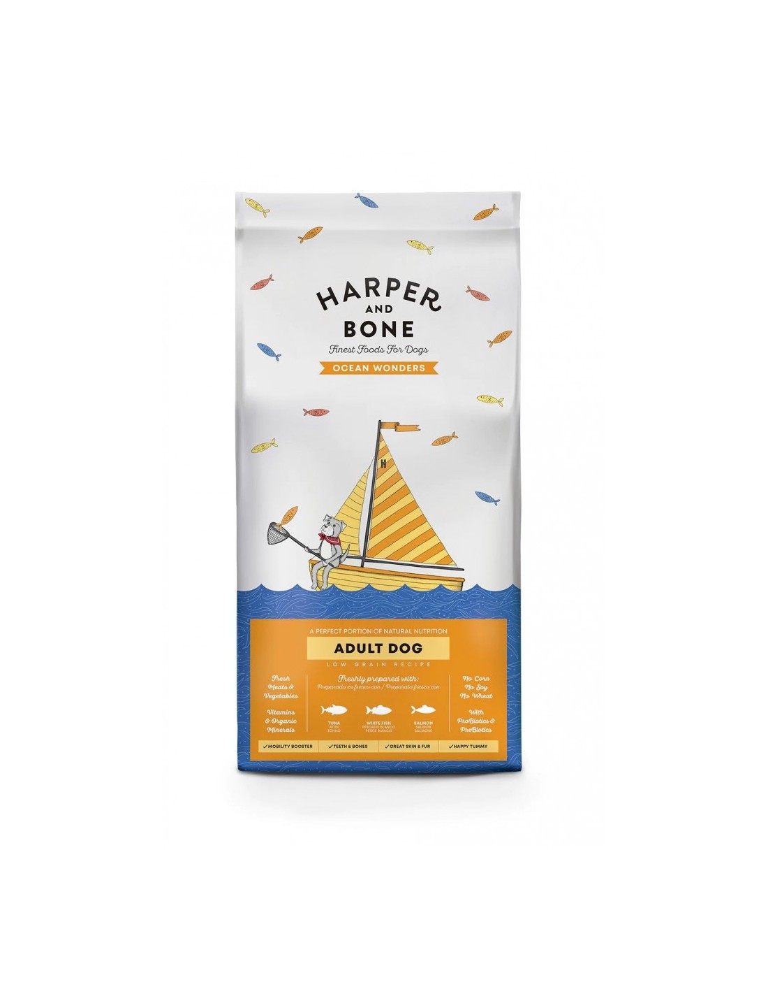 salmón preparado en fresco 14,6%, arroz extrusionado, atún deshidratado 12,3%, guisantes verdes enteros, atún preparado en fresco 7,9%, arroz integral 7,9%, cebada integral 6,3%, aceite de pollo (protegido con tocoferoles naturales) 4,6%, salmón deshidratado 4%, pescado blanco preparado en fresco 4%, avena integral 3,5%, proteína de arroz, salmón hidrolizado 2,4%, semillas de lino (fuente natural de ácidos grasos ?3) 0,5%, pulpa de remolacha, fibra de manzana, levaduras (Saccharomyces cerevisiae), minerales, brócoli fresco 1000 mg/kg, calabaza fresca 1000 mg/kg, manzanas frescas 1000 mg/kg, zanahorias frescas 1000 mg/kg, glucosamina 1000 mg/ kg, condroitina 600 mg/kg, pared celular hidrolizada de levaduras (fuente de MOS) 500 mg/kg, achicoria (fuente de FOS) 500 mg/kg, extracto de mandarina 500 mg/kg, Yucca schidigera 200 mg/kg, alga kelp 30 mg/kg, arándanos rojos enteros 30 mg/kg, rosa canina (rica en vitamina C) 30 mg/kg, té verde 30 mg/ kg, cúrcuma 30 mg/kg.