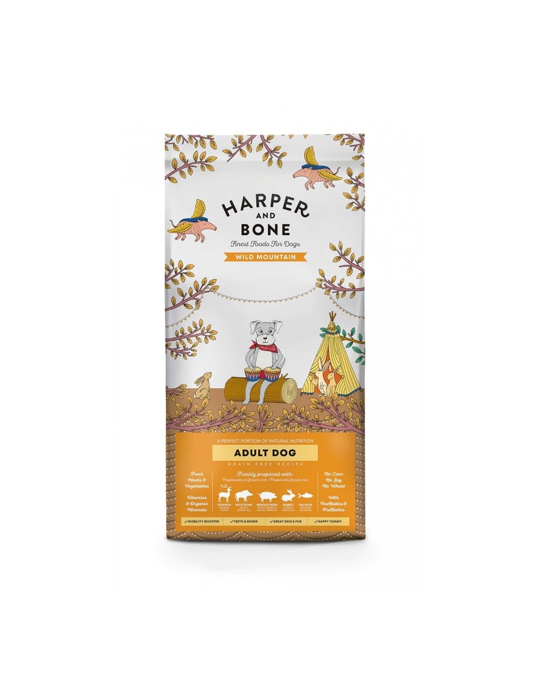 cerdo ibérico deshidratado 14,9%, patata deshidratada, aceite de pollo (protegido con tocoferoles naturales) 8,9%, guisantes verdes enteros, cerdo ibérico deshuesado preparado en fresco 7,2%, almidón de patata, ciervo deshidratado 4,2%, salmón preparado en fresco 4,2%, conejo deshuesado preparado en fresco 4,2%, jabalí deshuesado preparado en fresco 4,2%, garbanzos enteros 4,2%, guisantes amarillos enteros 4%, fibra de manzana, patata dulce deshidratada 2,1%, minerales, pavo hidrolizado 1,7%, hígado de cerdo hidrolizado 0,8%, pescado hidrolizado 0,8%, semillas de lino (fuente natural de ácidos grasos ?3) 0,6%, pulpa de remolacha, levaduras (Saccharomyces cerevisiae), brócoli fresco 1000 mg/kg, calabaza fresca 1000 mg/kg, manzanas frescas 1000 mg/kg, zanahorias frescas 1000 mg/kg, glucosamina 1000 mg/kg, condroitina 600 mg/ kg, pared celular hidrolizada de levaduras (fuente de MOS) 500 mg/kg, achicoria (fuente de FOS) 500 mg/kg, extracto de mandarina 400 mg/kg, Yucca schidigera 200 mg/kg, alga kelp 30 mg/kg, arándanos rojos enteros 30 mg/kg, rosa canina (rica en vitamina C) 30 mg/kg, té verde 30 mg/kg, cúrcuma 30 mg/kg.