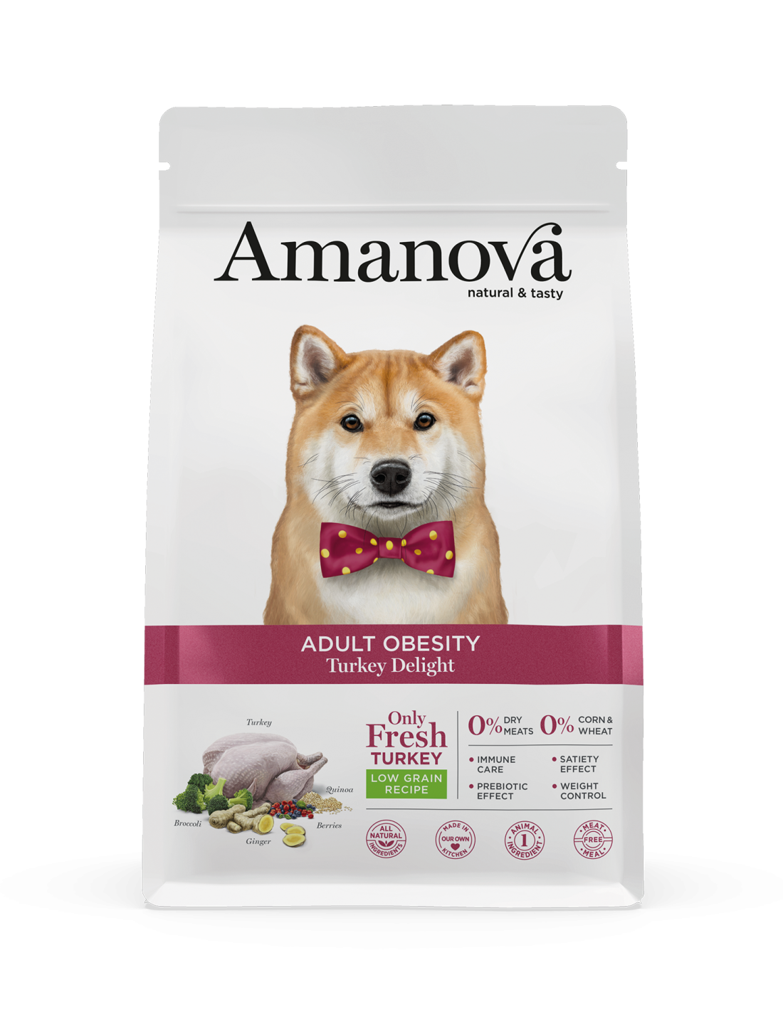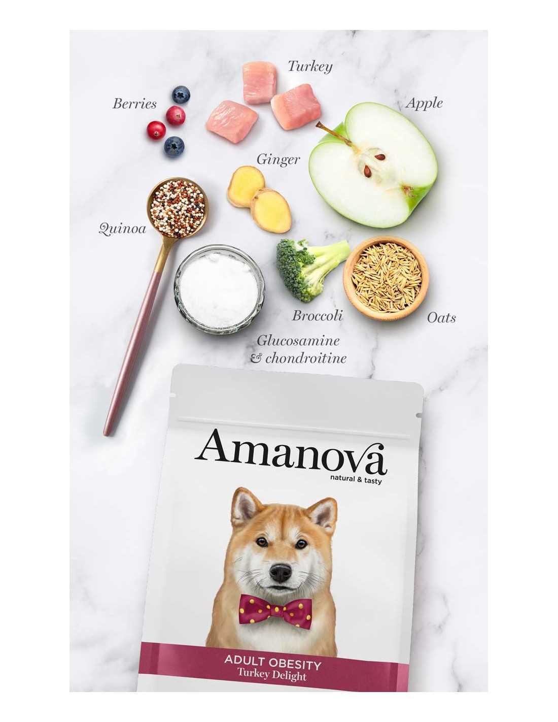 amanova adult obesity es un pienso hipoalergénico bajo en grasas y elaborado con pavo fresco como única fuente animal, una deliciosa carne rica en proteínas, baja en grasas y colesterol.
