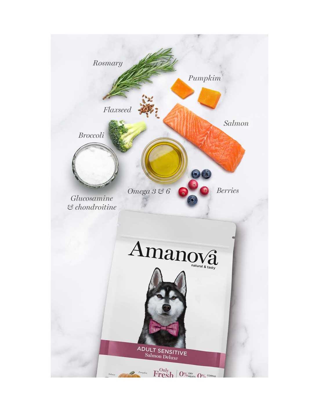 amanova adult sensitive es un pienso sin cereales para perros adultos de cualquier raza, especialmente para aquellos que tienen digestiones sensibles o que requieran un mayor cuidado en la piel y el pelo. preparado con salmón fresco como única fuente animal, aporta importantes cantidades de ácidos grasos omega-3, epa y dha que ayudarán a cuidar de su piel, pelo y articulaciones.