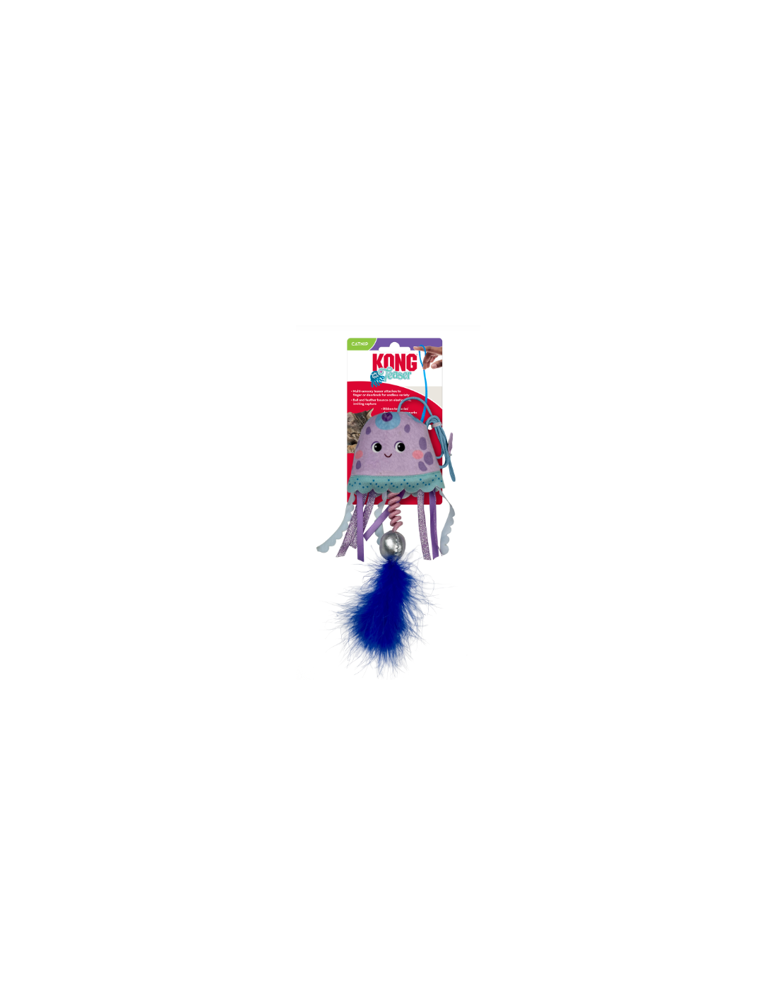 El KONG Jellyfish Teaser es un juguete multisensorial que satisface los instintos. Se coloca en un dedo para crear aventuras interactivas, o en el pomo de una puerta o en una manija para aventuras "submarinas" en solitario. La pelota y la pluma rebotan al estirar la cuerda elástica, lo que fomenta el juego de captura, mientras que los tentáculos de cinta que cuelgan irresistiblemente incitan el instinto de bateo.