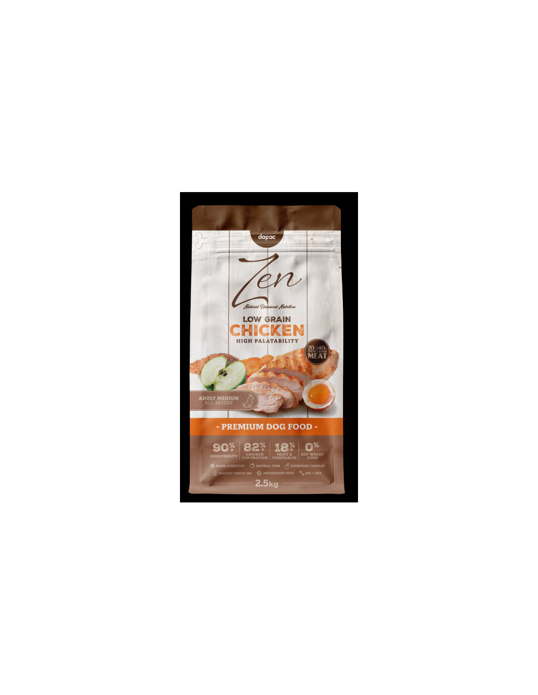 Zen Low Grain Chicken Medium adult está indicado para perros adultos de razas medianas. Es un alimento con un alto nivel de digestibilidad, gracias en parte a que el único cereal presente (y en baja cantidad) es el arroz integral, ingrediente que tiene un alto nivel de fibra.